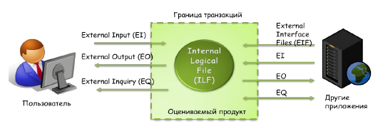 - EI (external inputs) — внешние входные транзакции, элементарная операция по обработке данных или управляющей информации, поступающих в систему из вне.