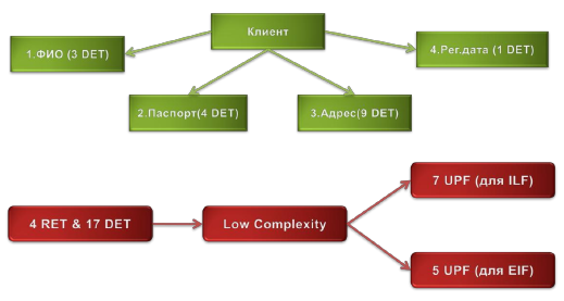 Объект «Клиент» содержит четыре логических группы данных, которые в совокупности состоят из 15 неповторяемых уникальное полей данных. Согласно матрице (Таблица 7), нам следует оценить сложность этого объекта данных, как «Low». Теперь, если оцениваемый объект относится к внутренним логическим файлам, то согласно Таблица 8 его сложность будет 7 не выровненных функциональных точек (UPF). Если же объект является внешним интерфейсным файлом, то его сложность составит 5 UPF.