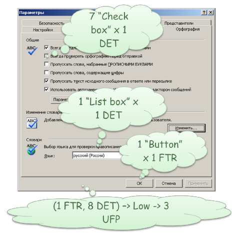 Каждый "Check box" оценивается, как 1 DET. Выпадающий список — 1 DET. Каждая управляющая кнопка должна рассматриваться как отдельная транзакция. Например, если оценивать управляющую транзакцию по кнопке «OK», то, для данной транзакции мы имеем 1 FTR и 8 DET. Поэтому, согласно матрице (Таблица 10), мы можем оценить сложность транзакции, как Low. И, наконец, в соответствие с матрицей (Таблица 12), данная транзакция должна быть оценена в 3 не выровненных функциональных точек (UFP).