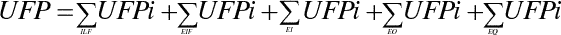 Общий объем продукта в не выровненных функциональных точках (UFP) определяется путем суммирования по всем информационным объектам (ILF, EIF) и элементарным операциям (транзакциям EI, EO, EQ).