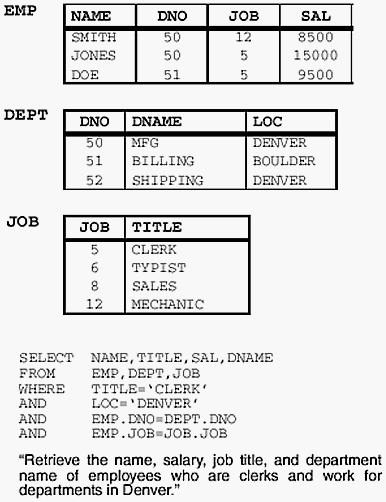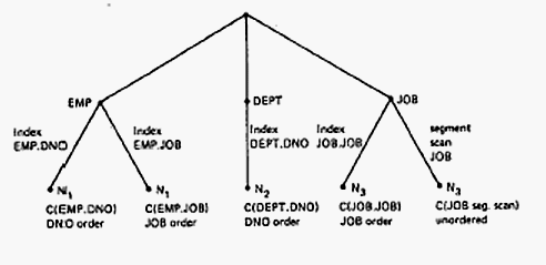 примере мы предполагаем, что соединение EMP-JOB является наиболее дешевым при доступе к JOB через индекс JOB. Это вполне вероятно, поскольку позволяет прямо считывать кортежи о соответствию JOB (без