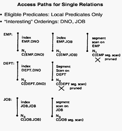 На рис. 3 мы видим, что путем доступа, выбранным для отношения DEPT, является индекс DNO. После доступа к DEPT через этот индекс мы можем выполнить слияние с EMP, используя индекс DNO на EMP, опять