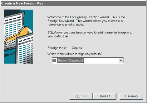 В утилите SQL Central внешние ключи создаются мастером Add Foreign Key. Для доступа к нему следует последовательно раскрыть папки Tables - <имя таблицы> - Foreign Keys. Мастер Add Foreign Key выполняет ряд шагов, которые мы рассмотрим по устоявшейся схеме (п.5.1). Работу мастера покажем на примере создания внешнего ключа таблицы Copies, который ссылается на таблицу Books.