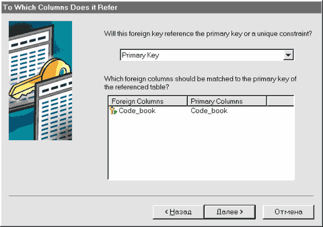 Пояснение. Добро пожаловать в Мастер создания внешних ключей. Этот Мастер позволяет вам создать ссылку на другую таблицу данных.