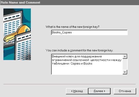 Следующее ниже поле окна представляет собой средство для ответа на поставленный вопрос. Назовем внешний ключ Books_Copies.