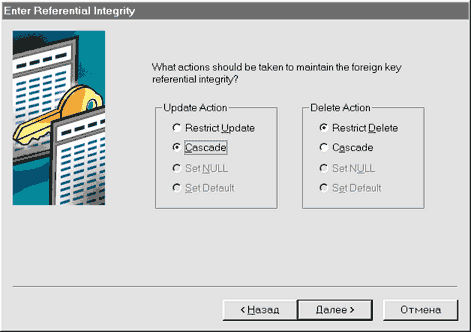 Для ответа на этот вопрос используются переключатели Update Action и Delete Action. Первый из них, Update Action, определяет действие, выполняемое при модификации значений полей родительской таблицы, на которые ссылаются поля внешнего ключа дочерней таблицы. Назовем эти поля родительской таблицы адресуемыми полями. Второй переключатель Delete Action предназначен для выбора действия, выполняемого при удалении записей родительской таблицы.
