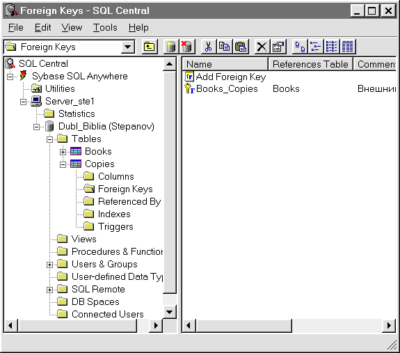 Для того, чтобы убедиться в утилите ISQL, в том что внешний ключ Books_Copies действительно был создан необходимо при помощи оператора SELECT проанализировать системное представление SYS.SYSFOREIGNKEYS.