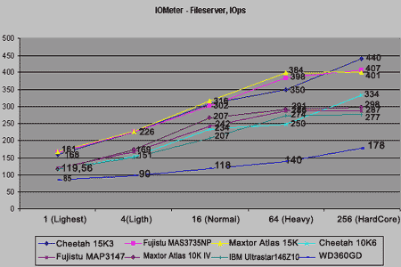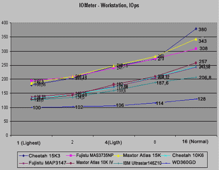Еще одна интересная особенность паттерна Workstation заключается в том, что в нем отрыв более производительных решений от менее скоростных ощущается особенно сильно на самой сложной нагрузке (16 запросов). Это заметно по углу наклона кривых, построенных по опорным точкам результатов тестирования. Как видно, наклон кривой Seagate Cheetah 15K.3 значительно больше, чем у WD360GD.