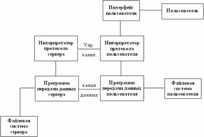 FTP (File Transfer Protocol или "Протокол Передачи Файлов") - один из старейших протоколов в Internet и входит в его стандарты. Обмен данными в FTP проходит по TCP-каналу. Построен обмен по технологии "клиент-сервер". На рисунке 3.22 изображена модель протокола.