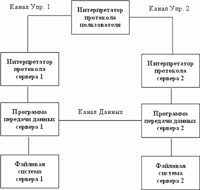 Возможна ситуация, когда данные могут передаваться на третью машину. В этом случае пользователь организует канал управления с двумя серверами и организует прямой канал данных между ними. Команды управления идут через пользователя, а данные напрямую между серверами (рисунок 3.23).