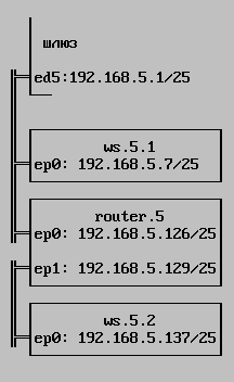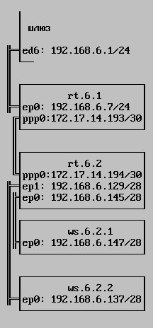 Рабочие станции ws.6.2.1 и ws.6.2.2 конфигурируются так же примитивно, как в сАмом первом рассмотренном сегменте, так что нет смысла их рассматривать. Но самое интересное здесь то, что никто, кроме подсоединенных к сегментам ws.6.2.1 и ws.6.2.2 машин (т.е. никто, кроме имеющих номера из диапазона 192.168.6.128/224), не знает, что это - две разные сетИ! Именно в этом проявляется вся мощь IP-маршрутизации - после того, как кому-то поручили маршрутизировать некоторый диапазон адресов, он имеет право распределять эти адреса между сегментами, причем никто вне этих сегментов не будет нуждаться в информации об этом распределении. Таким образом здесь наглядно проявляется масштабируемость IP-сетИ и ее способность к распределенному администрированию, а также возможность организовать эффективную работу в условиях сильной сегментированности. Вообще-то мы уже не раз сталкивались с этим явлением - каждый раз, когда использовалось `route add default [...]`, было понятно, что нас не интересуют подробности устройства внешнего мира, скрытого за обозначением "0.0.0.0/0"; просто здесь подчеркивается тот факт, что сокрытие структуры может производиться не только вверх по иерархии сетИ, но и вниз.