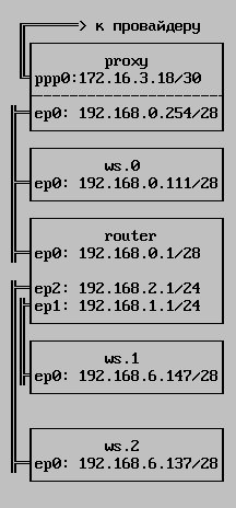Я не просто так отделил чертой ppp0: от ep0: - форвардинг на proxy запрещен, ибо извне (от провайдера) никому, кроме 172.16.3.19/30 пакетов не придет, а значит, машины из нашей сети не должны посылать пакеты наружу в связи с полной бесполезностью этого дела.