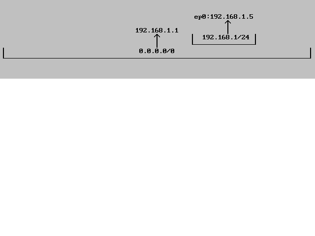 замечу, что маршрутизация "default" на самом деле есть "inet 0x0 netmask 0x0" и это надо прописывать, если старая версия команды route не понимает слова "default". Эта команда создала запись, в соответствии с которой все пакеты (все, потому что любой адрес подходит под 0.0.0.0/0) будут отправляться на машину, имеющую интерфейс 192.168.1.1. Информация о том, как можно добраться до интерфейса 192.168.1.1 содержится в предыдущей команде, которая определила способ доступа ко всем машинам 192.168.1.* через интерфейс ep0.