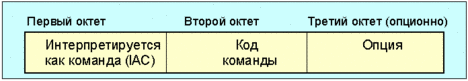 Блок данных процедуры TELNET содержит три байта и называется командой. Формат этого блока показан на рис. 4.5.3.1.