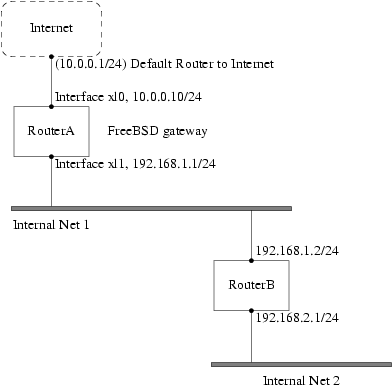 В этом сценарии, RouterA это наш компьютер с FreeBSD, который