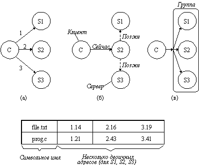 На рисунке 3.12 показаны три возможных способа репликации. При использовании первого способа (а) программист сам управляет всем процессом репликации. Когда процесс создает файл, он делает это на одном определенном сервере. Затем, если пожелает, он может сделать дополнительные копии на других серверах. Если сервер каталогов разрешает сделать несколько копий файла, то сетевые адреса всех копий могут быть ассоциированы с именем файла, как показано на рисунке снизу, и когда имя найдено, это означает, что найдены все копии. Чтобы сделать концепцию репликации более понятной, рассмотрим, как может быть реализована репликация в системах, основанных на удаленном монтировании, типа UNIX. Предположим, что рабочий каталог программиста имеет имя /machine1/usr/ast. После создания файла, например, /machine1/usr/ast/xyz, программист, процесс или библиотека могут использовать команду копирования для того, чтобы сделать копии /machine2/usr/ast/xyz и machine3/usr/ast/xyz. Возможно программа использует в качестве аргумента строку /usr/ast/xyz и последовательно попытается открывать копии, пока не достигнет успеха. Эта схема хотя и работает, но имеет много недостатков, и по этим причинам ее не стоит использовать в распределенных системах.