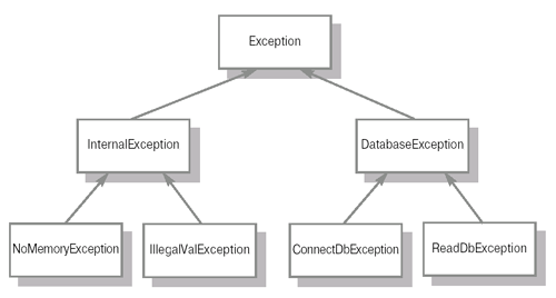 В приведенной на рисунке 16.1 структуре классов все исключительные ситуации делятся на ситуации, связанные с работой базы данных (класс DatabaseException), и внутренние ошибки программы (класс InternalException). В свою очередь, ошибки базы данных бывают двух типов: ошибки соединения (представленные классом ConnectDbException) и ошибки чтения (ReadDbException). Внутренние исключительные ситуации разделены на нехватку памяти (NoMemoryException) и недопустимые значения (IllegalValException).