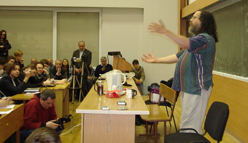 Как и предполагалось, первый и второй день своего визита в Россию Ричард Столлман посвятил встречам со студентами и преподавателями двух ведущих российских университетов – МГУ и МФТИ. По просьбе Столлмана на обе встречи допускались все желающие, что в условиях пропускной системы в университетах было непросто организовать.