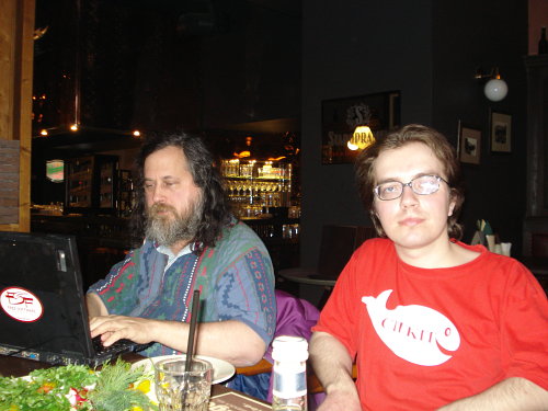 После трудного похода на Горбушку Ричард и сопровождавшие его лица сочли уместным плотно поужинать. При этом Столлман все время продолжал работать — в автомобиле по дороге в ресторан он отправлял письма, не расставался с ноутбуком и за столом.