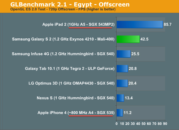В тесте GLBenchmark 2.1 процессор A5 набрал 85,7 балла против 11,2 у А4. для сравнения: чип Samsung Exynos 4210 с тактовой частотой 1,2 ГГц показал результат в 42,5 балла, а «система на чипе» Tegra 2 — 20,8.