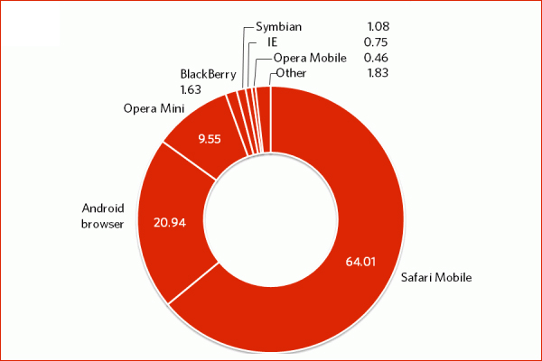 Самым распространённым браузером для мобильных устройств остаётся Safari Mobile с 64,01%. Далее следуют обозреватель для платформы Android (20,94%) и Opera Mini (9,55%).