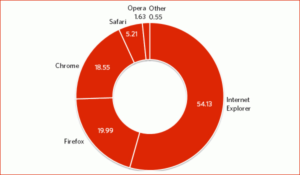 Internet Explorer остаётся самым популярным браузером среди пользователей персональных компьютеров. В течение месяца продукт Microsoft укрепил позиции на 0,5% и теперь занимает 54,13% глобального рынка. Это самый высокий показатель с сентября 2011-го, когда доля IE равнялась 54,39%.