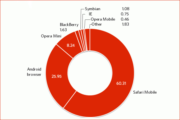 В сегменте мобильных браузеров расстановка сил иная. Лидерами остаются Safari Mobile и обозреватель платформы Android с 60,31 и 25,95% рынка. Далее идут Opera Mini (8,24%) и браузер BlackBerry-устройств (1,63%).