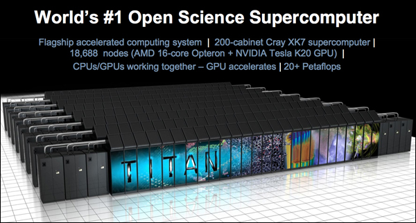Возглавляет рейтинг система Titan, смонтированная в Министерства энергетики США (). Этот суперкомпьютер, оснащённый 16-ядерными серверными процессорами Opteron 6274 и ускорителями , обладает производительностью в 17,6 петафлопса.
