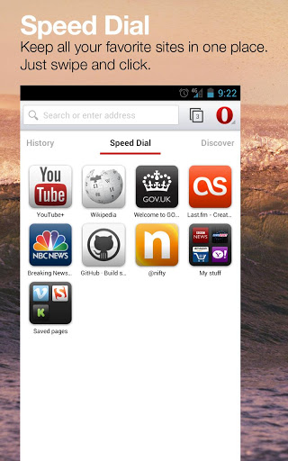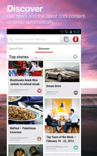 Новинкой интерфейса является панель Discover, предназначенная для обнаружения нового контента в Сети и слежения за новостными лентами по интересам. При этом браузер сам формирует подборку источников в зависимости от выбранной тематики и производит фильтрацию популярного и востребованного контента. Адресная строка комбинирует в себе поле для ввода адресов и форму для отправки поисковых запросов. Имеется возможность наглядной оценки всех открытых вкладок. Доступен режим приватного просмотра. Удобно реализована возможность работы с историей, достаточно сдвинуть пальцем экран вправо для отображения в левой части сводки по ранее открытым страницам.