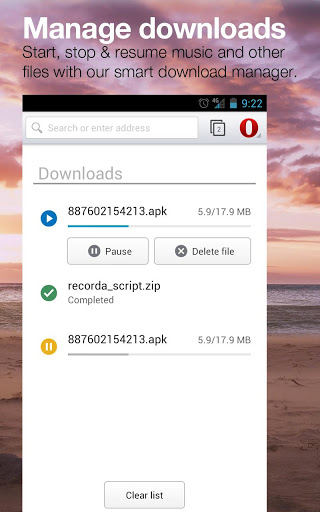 В состав браузера включён полноценный менеджер загрузки, в который интегрированы все необходимые инструменты для управления загрузкой мультимедия контента. Менеджер позволяет запускать, останавливать и временно приостанавливать загрузки, переименовывать файлы. При желании отложить просмотр определённых страниц добавлена функция сохранения на потом, позволяющая загрузить страницу и в дальнейшем вернуться к ней даже при отсутствии сетевого соединения, например, в самолёте.