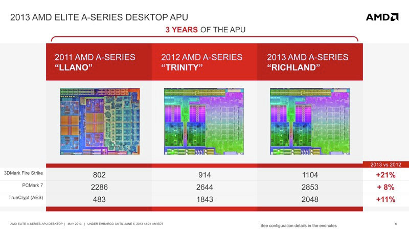 Новая линейка процессоров представлена моделями A6, A8 и A10 и носит кодовое наименование Richland. Они пришли на смену предыдущему, второму поколению процессоров AMD A-Series с тактовой частотой 3,2-4,1 ГГц, известных под наименованием Trinity.