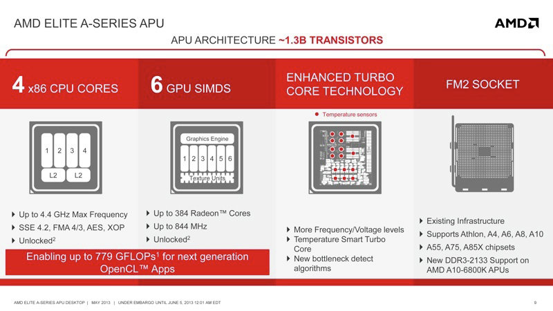 Согласно данным AMD, на процессорном кристалле сегодня размещается около 1,3 миллиардов транзисторов, относящихся к графическому блоку. Они занимают 42% полезной площади кристалла. Для сравнения площадь кристалла, занятая под транзисторы в новых процессорах Haswell Core, составляет около 31%. По мнению AMD, ее гибридная архитектура строительства процессоров отличается более высокой сбалансированностью, чем решение Intel.