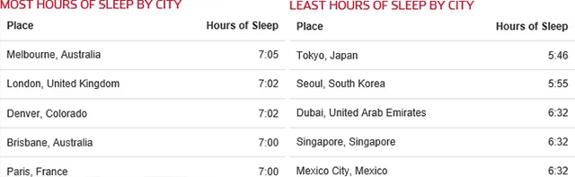 Люди, как правило, не досыпают. Даже в таких благополучных с точки зрения отдыха городах, как Мельбурн, Лондон, Брисбен, Денвер и Париж в среднем жители спят лишь на несколько минут больше минимально рекомендованных Центром по контролю и заболеваний США семи часов в сутки. А жители Токио, Сеула, Дубая, Сингапура и Мехико в среднем тратят на сон лишь шесть или шесть с половиной часов в день.