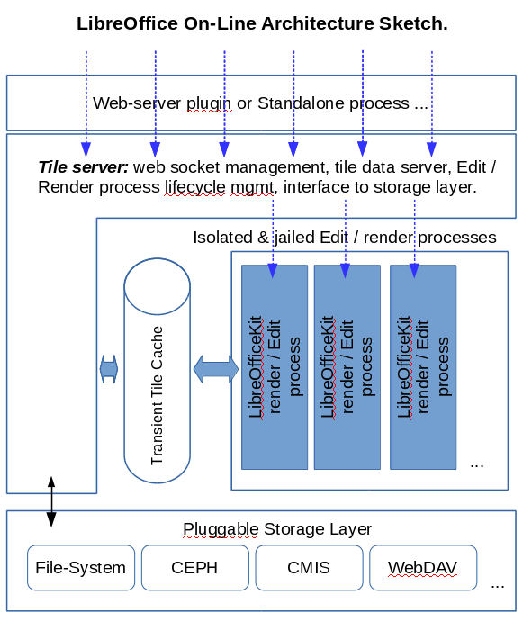 Серверная часть включает в себя два компонента: LibreOfficeKit, используемый в LibreOffice для выполнения вычислений, мозаичной отрисовки и многослойной компоновки документа, и новый серверный компонент Tile Server для организации взаимодействия с браузером, передачи изображений с частями интерфейса, организации кэширования кусочков изображений и работы с хранилищем документов. В зависимости от число подключенных клиентов Tile Server запускает для каждого клиента отдельные экземпляры LibreOfficeKit, которые выполняются в изолированном окружении. Для всех экземпляров LibreOfficeKit используется общий кэш.