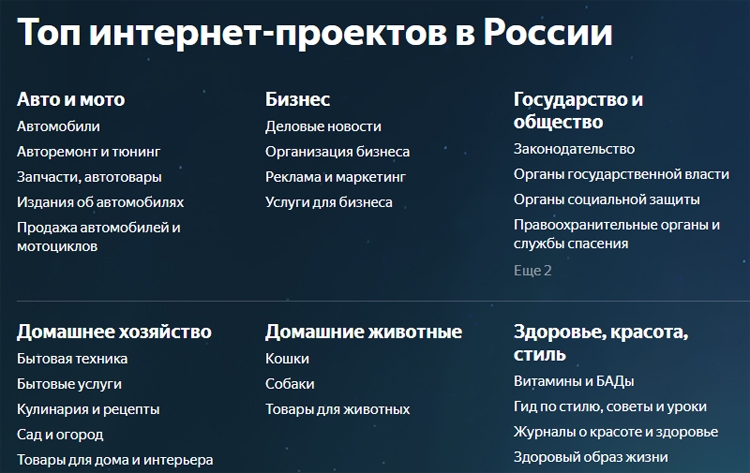 Сервис «Топ интернет-проектов в России» охватывает 10 тысяч самых популярных ресурсов. «Яндекс» рассчитывает их месячную аудиторию на основе обезличенных данных своих продуктов.