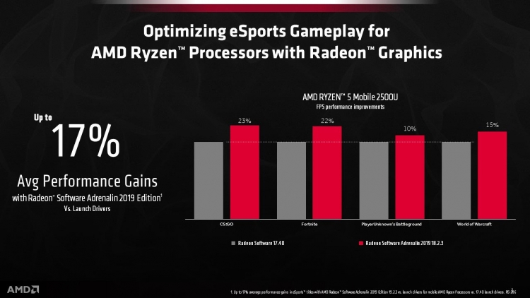 В частности, AMD сообщила, что благодаря Radeon Software 19.2.3 в среднем её чипы Ryzen Mobile с графикой Vega получили 10-процентный прирост производительности по сравнению со старым драйвером 17.40 (вышел в момент запуска APU). Более того, в популярных многопользовательских проектах вроде Counter Strike: Global Offensive, Fortnite, PlayerUnknown’s Battleground и World of Warcraft прирост составил 17 %.