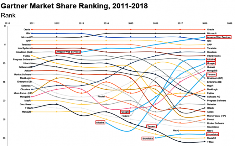 Лидерами рынка СУБД по итогам 2018 года остались Oracle и Microsoft. На третье место поднялась Amazon Web Services (AWS), опередив IBM. Пятёрку лучших замкнула SAP.