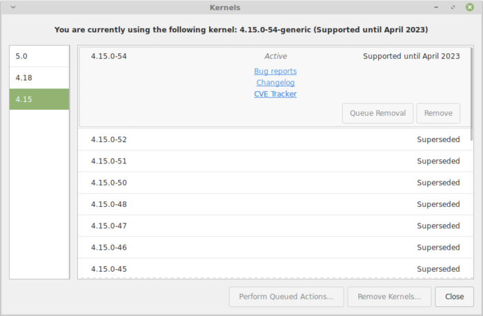 - Расширены возможности менеджера обновлений. В списке доступных для установки ядер Linux обеспечен показ времени поддержки каждого ядра. Для установки теперь сразу можно выбрать несколько ядер. Для удаления устаревших ядер добавлена специальная кнопка, а также обеспечена возможность автоматического удаления ядер, которые больше не нужны.
