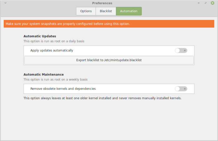 Упрощена и переведена на новый набор виджетов Xapp Gsettings секция настроек в менеджере обновлений. Добавлена возможность помещения в чёрный список определённых версий пакетов. Реализована блокировка перезапуска/выключения во время выполнения процесса автоматической установки обновлений. Добавлен лог /var/log/mintupdate.log. Обеспечено автоматическое обновление списка при изменении кэша APT. Добавлены предупреждения о необходимости перезагрузки после обновлений ядра и о скором (начинает выводиться за 90 дней) прекращении поддержки выпуска Linux Mint. Подготовлена отдельная страница с информацией о наличии новой версии менеджера обновлений;