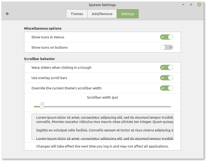 Добавлены новые виджеты для создания конфигураторов, упрощающие написание диалогов настройки и делающие их оформление более целостным и единым с интерфейсом Cinnamon. В конфигуратор добавлены настройки внешнего вида и толщины полос прокрутки.