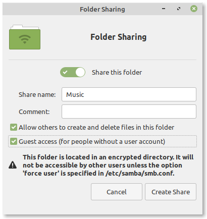 samba, помещение пользователя в группу sambashare и проверка/изменение прав доступа на совместный каталог, без необходимости ручного выполнения данных операций из командной строки. В новом выпуске дополнительно добавлена настройка правил межсетевого экрана, проверка прав доступа не только на сам каталог, но и на его содержимое, и обработка ситуаций с хранением домашнего каталога на зашифрованном разделе (запрашивает добавление опции "force user").
