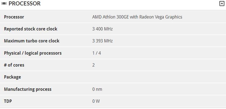 Как нетрудно догадаться, новинка будет слабо отличаться от своего предшественника — Athlon 200GE. В новом Athlon 300GE мы увидим два физических ядра и четыре вычислительных потока, а также встроенную графику Vega, скорее всего Vega 3. Последняя будет обладать тремя вычислительными блоками, что означает наличие 192 потоковых процессоров. Максимальная частота процессорных ядер достигает 3,4 ГГц. Это на 200 МГц выше, чем у Athlon 200GE. А вот частоту встроенной графики тест определить не смог, ведь вряд ли она равна лишь 400 МГц, как указано в базе данных. Скорее всего, частота GPU также немного вырастет по сравнению с предшественником.