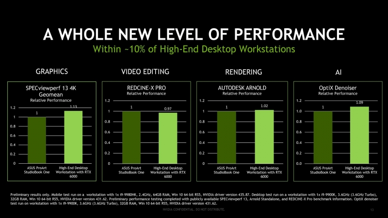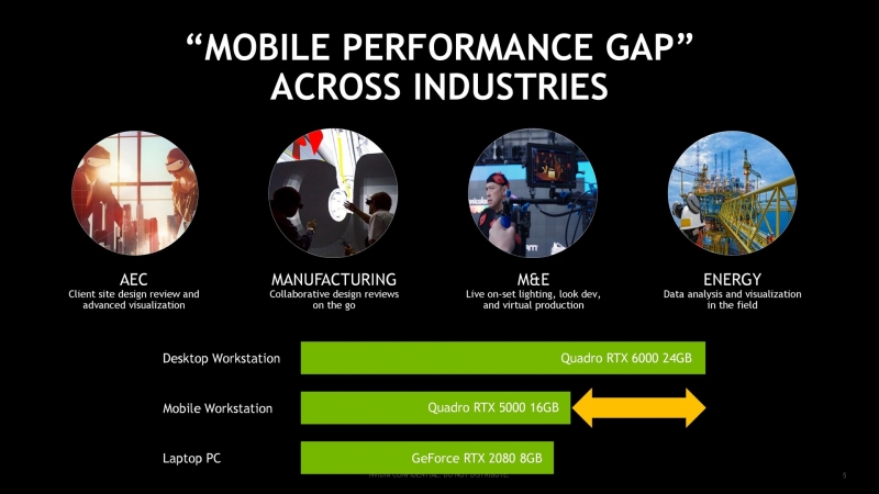 NVIDIA заявляет, что мобильная версия Quadro RTX 6000 устраняет существенный разрыв в производительности, который в настоящее время существует между мобильной Quadro RTX 5000 и настольной Quadro RTX 6000. Отставание должно составить примерно 10 % при обработке графики, редактировании видео, рендеринге и в задачах, связанных с Искусственным интеллектом.