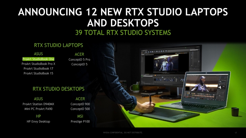 На основе данной эталонной системы был создан ASUS ProArt StudioBook One, с которым мы уже подробно познакомились сегодня в рамках IFA 2019. Кроме того, сертификацию RTX Studio теперь имеют ещё 12 устройств. Среди них, например, ноутбуки Acer ConceptD 7 Pro и ConceptD 9 Pro, также продемонстрированные на IFA 2019.
