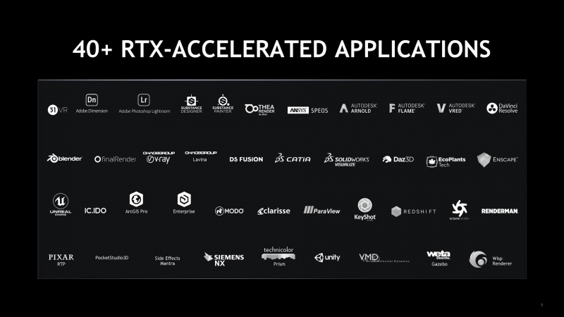 NVIDIA также упоминает о поддержке трассировки лучей в реальном времени в более чем 40 профессиональных приложениях, включая Adobe Photoshop Lightroom, Autodesk Arnold, Blender, Renderman и другие.