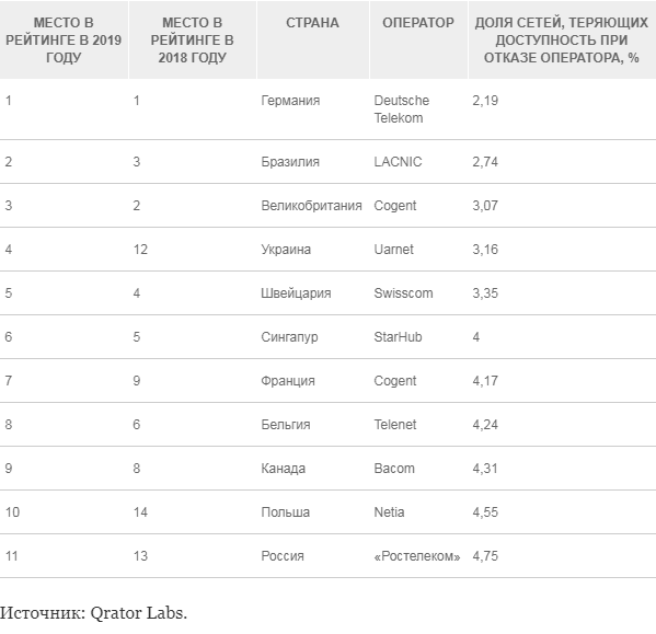 Согласно отчету Qrator Labs, в рейтинге устойчивости национальных сегментов интернета Россия поднялась на 11-ю позицию. Это на две строчки выше, чем в прошлом году.
