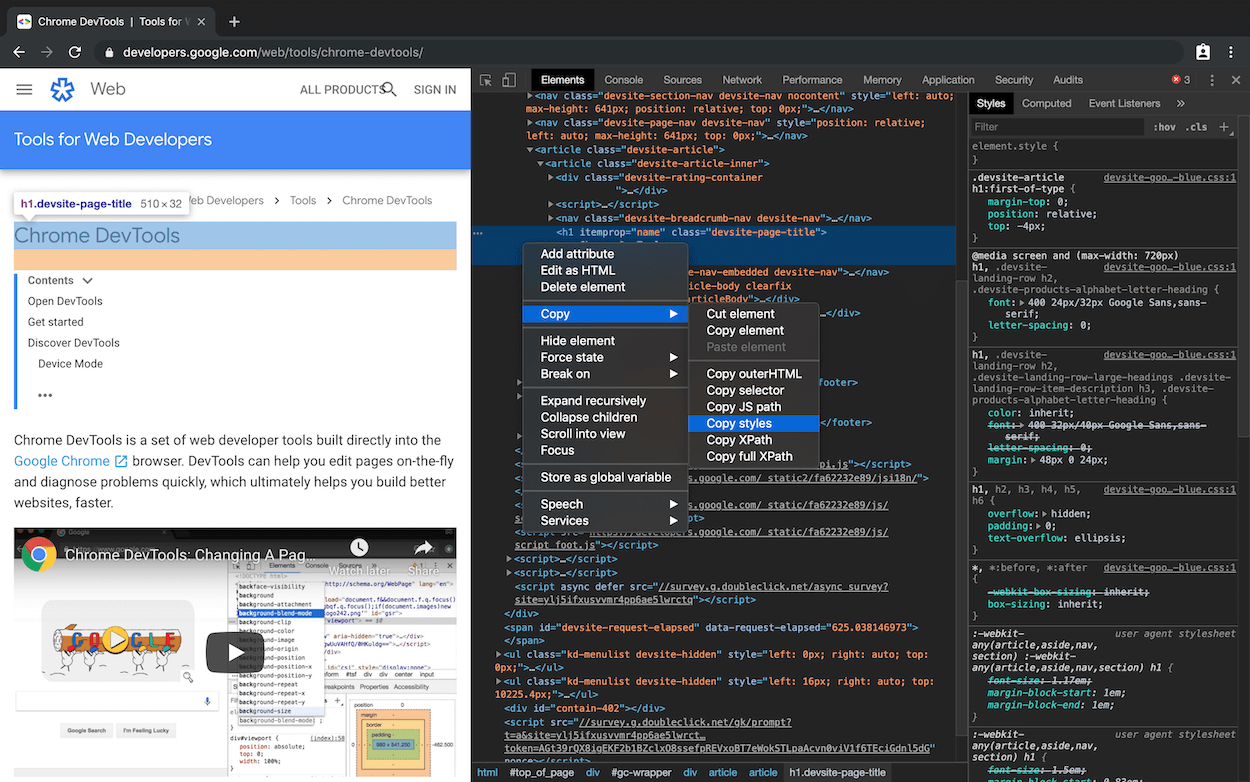 - В инструментах для разработчиков добавлена возможность копирования в буфер обмена CSS-свойств узла DOM через контекстное меню, вызываемое правым кликом на узле в дереве DOM. Добавлен интерфейс (Show Rendering/ Layout Shift Regions) для отслеживания сдвигов разметки из-за отсутствия заглушек под рекламу и изображения (когда при просмотре загрузка очередного изображения сдвигает текст вниз). Панель аудита обновлена до выпуска Lighthouse 5.1. Обеспечено автоматическое переключение на тёмную тему оформления DevTools при использовании тёмной темы в ОС. В режиме инспектирования сети добавлен признак загрузки ресурса из кэша упреждающей загрузки (prefetch cache). В панели Application добавлена поддержка отображения push-сообщений и уведомлений. В web-консоли при предпросмотре объектов теперь отображаются и приватные поля классов;