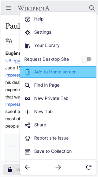 - Универсальное меню, через которое можно получить доступ к настройкам, библиотеке (избранные страницы, история, загрузки, недавно закрытые вкладки), выбору режима отображения сайта (показ десктоп-версии сайта), поиску текста на странице, переходу в приватный режим, открытию новой вкладки и навигации между страницами;