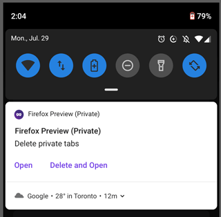 - При открытии вкладки в приватном режиме обеспечен вывод закреплённого уведомления, напоминающего об активности приватного режима. Через уведомление сразу можно закрыть все приватные вкладки или открыть браузер. На стартовую страницу также добавлена кнопка для закрытия всех приватных вкладок;
