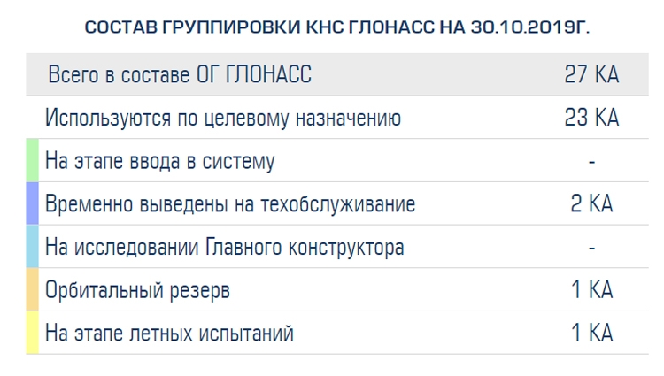 В настоящее время в состав российской системы ГЛОНАСС входят 27 космических аппаратов. Из них 23 используются по целевому назначению. Ещё два спутника временно выведены на техобслуживание; по одному находятся на этапе лётных испытаний и в орбитальном резерве.
